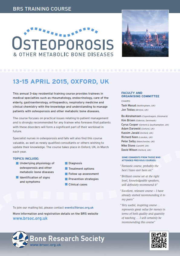 This three-day residential training course aims to provide trainees in medical specialties such as rheumatology, endocrinology, care of the elderly, gastroenterology, orthopaedics, respiratory medicine and clinical chemistry with the knowledge and understanding to manage patients with osteoporosis and other metabolic bone diseases. The course is intended to focus on practical issues relating to patient management and is strongly recommended for any trainee who foresees that patients with these disorders will form a significant part of their workload in future. A stimulating interactive format will be employed combining lectures, panel discussions, debates and workshops. Specialist nurses in osteoporosis and falls will also find this course valuable, as well as newly qualified consultants or others wishing to update their knowledge in this field.